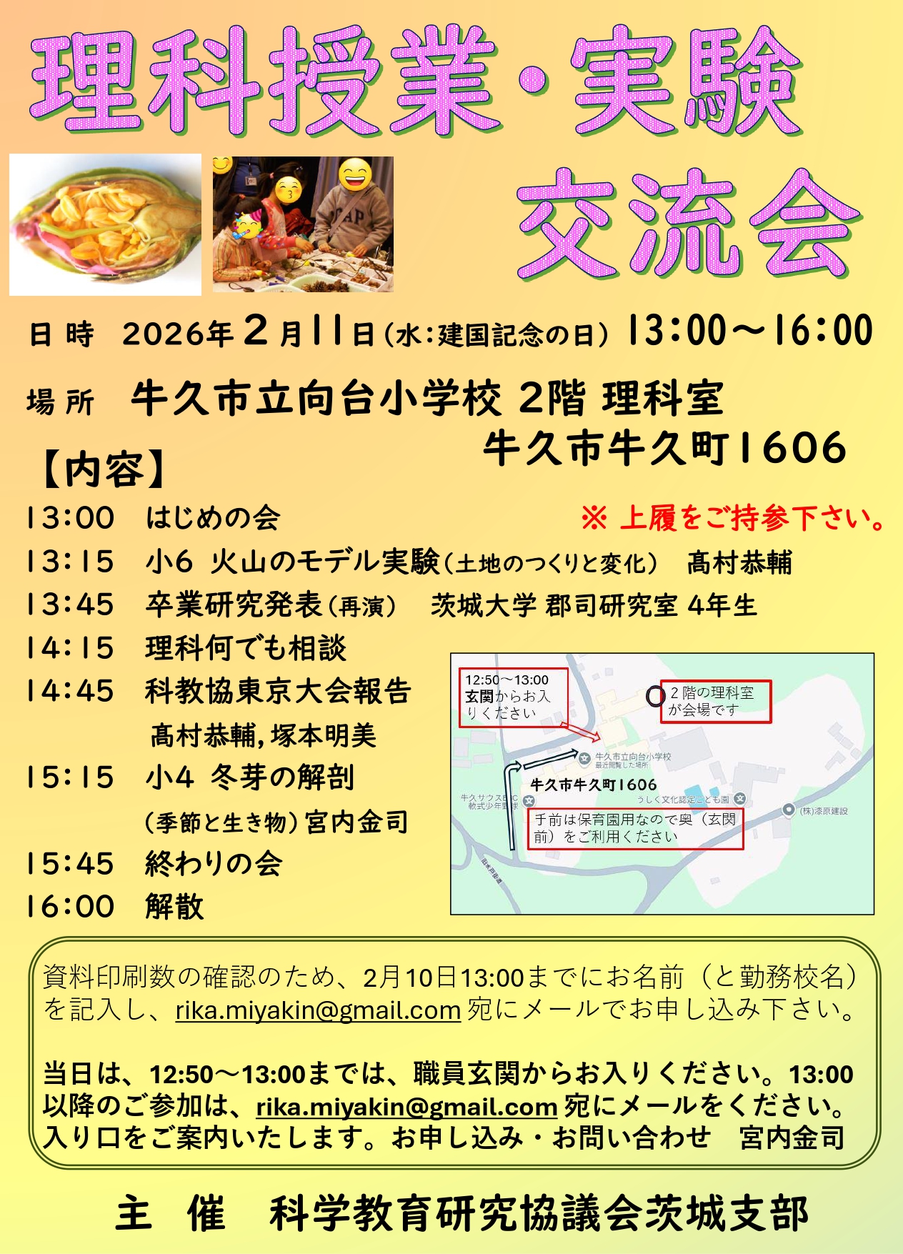 ホーム>お知らせ 2026.2.11 科教協茨城支部 理科授業・実験交流会 ■とき:2月11日(水)13:00-16:00 ■会場:牛久市立向台小学校 2階 理科室 ■お申し込み・お問い合わせはメールで rika.miyakin(アットマーク)gmail.com 宮内金司 まで ■上履きをご持参ください。 ■チラシpdf ■主催:科教協茨城支部 お知らせ, 研究会